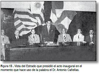 El primer evento de carácter internacional que realizó la SAU fueron las Primeras Jornadas Rioplatenses de Anestesiología, en enero de 1956. Una numerosa delegación, integrada por anestesistas de Buenos Aires, Córdoba y Rosario concurrió a Montevideo, presidida por el titular de la Asociación Argentina, José Catterberg. La Comisión Organizadora estuvo presidida por Antonio Cañellas, actuando en la Secretaría, Dardo Vega (25), como se ve en la figura15.
