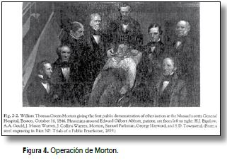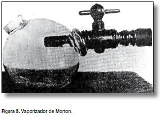 El 16 de octubre de 1846, en Boston, Morton obtuvo permiso para hacer una demostración de anestesia con éter a un paciente a quien el cirujano John Collins Warren iba a extirparle un tumor benigno submaxilar en el Massachussets General Hospital. Morton se demoró en llegar porque tuvo que hacer unos ajustes de última hora en el aparato que llevaba. Se trataba de un frasco esférico de vidrio, en cuyo interior había una esponja impregnada en éter, que tenía dos aberturas: una al exterior, por donde penetraba el aire atmosférico en cada inspiración, y otra conectada a un tubo que iba a la boca del paciente (figura 3).