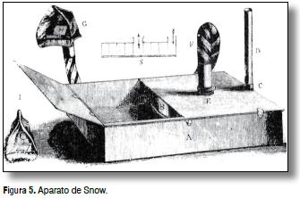En 1850, John Snow, en Londres, realiza su notable contribución a la teoría y práctica clínicas de la anestesia, por lo que es considerado como el primer médico especializado en esta disciplina. Tuvo oportunidad de trabajar con destacados cirujanos de la época, y pudo describir las distintas etapas de la anestesia con éter, basado en las respuestas que observaba en el paciente. Rápidamente se dio cuenta de los inconvenientes de los inhaladores de éter utilizados, que permitían la reinhalación del anestésico a través de la mascarilla. Perfeccionó éstas, instalando válvulas unidireccionales y una mascarilla maleable y bien ajustada a la cara del paciente, pero que permitía reclinar la válvula espiratoria para lograr que éste respirara el aire ambiente. La mascarilla iba conectada a un vaporizador para el éter, colocado en un baño de agua caliente, a fin de mantener la volatilidad del agente (Fig.5).