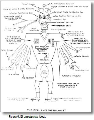 Durante las IV Jornadas de Anestesiología, realizadas en Colonia en 1984, el Laboratorio Abbott distribuyó una lámina, donde en forma jocosa se muestra cómo un anestesista debe multiplicar sus dedos, manos, ojos, etcétrea, para un mejor control y vigilancia de su paciente (figura 6).