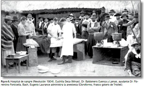 Toda esta cirugía se realizaba en Montevideo, fundamentalmente en el Hospital de Caridad, que posteriormente pasó a llamarse Hospital Maciel. Pero no debe olvidarse que durante las luchas armadas, que tenían lugar en esas décadas, muchas veces los pacientes heridos no podían ser trasladados, y el personal médico que acompañaba a los batallones revolucionarios tenía que improvisar los llamados “hospitales de sangre” y realizar operaciones quirúrgicas en las condiciones que se pueden apreciar en la figura 9.