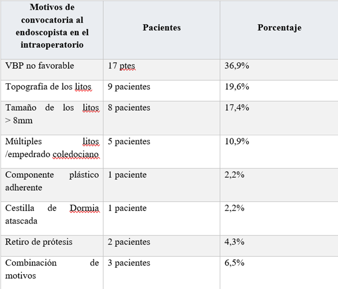 Los motivos de convocatoria al endoscopista en el intraoperatorio fueron: vía biliar no favorable (cístico arrosariado, que no confluye a la derecha de la VBP o su inserción muy baja en el colédoco): 17 pacientes (36,9%); topografía de los litos (por encima del confluente cístico coledociano y a nivel de los hepáticos): 9 pacientes (19,6%); tamaño de los litos mayor a 8mm: 8 pacientes (17,4%); presencia de litiasis múltiples o empedrado coledociano: 5 pacientes (10,9%). En un paciente no se pudo acceder a la VBP por vía transcística debido a un gran componente plástico adherente locorregional (2,2%). En otro paciente la cestilla de Dormia pasada por vía transcística quedó atascada (2,2%). En otros 3 pacientes (6,5%) la convocatoria se debió a combinación de motivos (cálculo grande + topografía; múltiples cálculos + topografía, VBP no favorable + lito grande). Entre los casos de convocatoria que no se debían a litiasis, se encuentran dos casos para la extracción de prótesis biliar colocada previamente (4,3%). (Tabla 1)