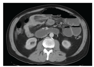 Dos años después del diagnóstico, consultó en el servicio de emergencia por un cuadro de dolor abdominal difuso de 48 horas de evolución, tipo cólico, acompañado de náuseas, vómitos y deposiciones líquidas. Concomitantemente, presentó marcada astenia y adinamia.