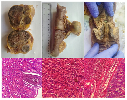 El informe anatomopatológico reveló una neoplasia sólida en el intestino delgado caracterizada por la presencia de focos de necrosis, células epitelioides y fusiformes con intenso pleomorfismo nuclear y pigmento melánico citoplasmático, hallazgos compatibles con Melanoma. La lesión infiltraba todas las capas intestinales sin alcanzar la subserosa, con cabos quirúrgicos libres. Adicionalmente, se identificó un conglomerado metastásico en los ganglios mesentéricos. (Fig.3)