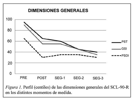 En cuanto a los parámetros sintomatológicos generales podemos señalar que las puntuaciones obtenidas disminuyeron significativamente tanto a nivel de número total de síntomas (PST) como malestar general (GSI), si bien las medidas correspondientes a malestar medio sintomatológico (PSDI) no disminuyeron en la misma proporción (situación lógica atendiendo a la disminución del PST) (Tabla 2; Figura 1).