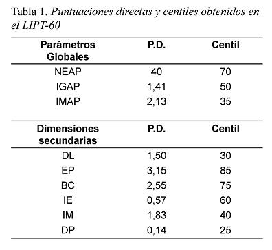 Inicialmente se administró a la paciente el LIPT-60 para verificar si nos encontramos ante un supuesto compatible con una situación de acoso laboral o por el contrario se tratase de otro tipo de problemática en el lugar de trabajo. A este respecto, se debe señalar que siguiendo las consideraciones interpretativas de los autores de la prueba, nos encontraríamos ante un caso muy probablemente de acoso laboral si el centil correspondiente a la puntuación del IGAP fuese al menos 60 o en su defecto dos de las subescalas de la prueba, todo ello en relación al baremo de población acosada. En el caso de la paciente que nos ocupa nos encontramos en la segunda situación, el centil de su IGAP no alcanza 60 (IGAP=50), sin embargo sí lo hacen tres de las seis subescalas (entorpecimiento del progreso, bloqueo de la comunicación e intimidación encubierta) (Tabla 1), por lo que podemos señalar que la situación descrita es propia de un caso de mobbing.