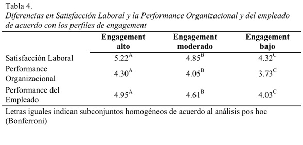 Tabla 4: Diferencias en Satisfacción Laboral y la Performance Organizacional y del empleado de acuerdo con los perfiles de engagement.