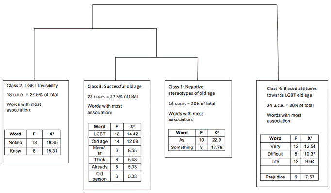 From the observation and interpretation of the data obtained in the research, it could be noticed that, in general, many stereotypes of LGBT aging and old age presented in previous studies are confirmed. Thus, the lexical contents that frame the dendogram within each identified class will be discussed.