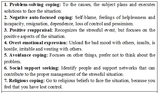 Two major categories of coping ways are modes are thus distinguished: based on the resolution of the objective problem, e.g., the development of cognitive and behavioral strategies, planning solution alternatives, searching for information, formulating a plan of action, etc.; directed to the people´s own emotion, related to avoid or distance from the problem, the self-reproach or the re-exaltation of the positive aspects, in order to modify the way in which the person lives the stressful situation even in those cases in which those who can not do anything to modify it (Lazarus & Folkman, 1984, 1986).