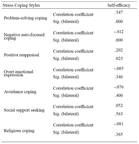 The Spearman's Rho coefficient was calculated, finding a significant positive association between the level of Self-efficacy of the participants and the Stress Coping Style called Problem-solving coping (ρ = .347; p = .000). This result indicates that the better and more appropriate are the judgments about one's own subjective abilities, the students will apply a Coping Style that involves the analysis of the causes of the problem and the planning and execution of solutions to face stressful situations.