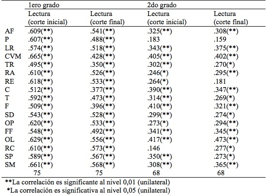 Según el análisis de correlaciones, todas las áreas del desarrollo son importantes para explicar la lectura en el 1er y 2do grado escolar. Sin embargo, el ANOVA de regresión indicó que algunas tienen mayor peso para pronosticar.