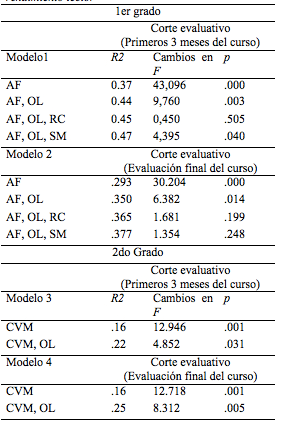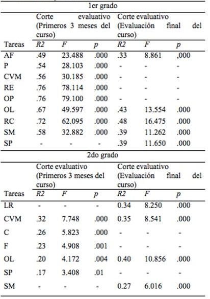 El ANOVA de regresión indicó que en el 1er grado, ocho tareas de 17, mostraron valores significativos para pronosticar el rendimiento de la lectura en los primeros tres meses del curso escolar: SM, CVM, OP, OL, R, RC, AF y P. Este mismo análisis a finales del curso, indicó que las tareas con valores significativos para pronosticar fueron: RC, SM, SP, OL y AF (ver tabla 2). Finalmente, las tareas que mostraron valores significativos en los dos momentos del corte evaluativo fueron: SM, AF, OL y RC.