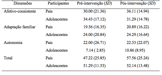 De modo complementar, os dados sobre suporte familiar, obtidos a partir da aplicação do Inventário de Percepção do Suporte Familiar (Baptista, 2009), indicaram que houve um aumento nas médias obtidas pós-intervenção na maioria das dimensões avaliadas por pais e adolescentes. Portanto, acredita-se que houve ampliação do reconhecimento familiar sobre tal suporte, embora não seja possível afirmar se há diferença estatística entre os dois momentos devido à restrição do tamanho da amostra. Tabela 2