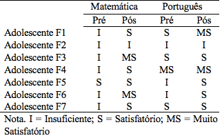 Constatou-se, ainda, que grande parte dos alunos avaliados apresentaram melhora no desempenho global e foram aprovados. A Tabela 3 mostra os conceitos obtidos pelos adolescentes nas disciplinas de matemática e português, revelando que houve melhora em 57% das avaliações realizadas, e manutenção em 43% delas. Os professores indicaram, em parecer descritivo, que os alunos que mantiveram o conceito apresentaram melhorias qualitativas em termos de comportamento e comunicação em sala-de-aula, e na interação com professores e colegas. Inclusive, nas situações em que o conceito obtido se manteve insuficiente, houve aprovação pelo Conselho de Classe devido ao reconhecido progresso obtido.