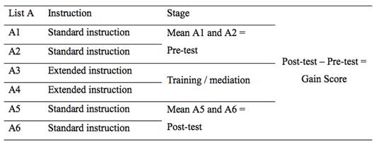In its original version (Rey, 1964) the AVLT consists in a list of 15 simple words (list A) that the evaluator reads aloud asking the evaluated to repeat them. List A is read 5 times (trials A1 to A5), and the evaluator records the number of words the subject remembered in each trial. The Auditory Verbal Learning Test - Learning Potential version (AVLT-LP) is the adaptation of the traditional AVLT to assess learning potential (Wiedl, Wienobost, & Schöttke, 1999, Spanish version of Calero, 2000). In the AVLT-LP the evaluator presents list A for 6 times (trials A1 to A6) and, in the intermediate trials (A3 and A4) the evaluator introduces the mediation or training. The mediation consists of a given feedback, monitoring and reinforcement of the words recalled by the subject. In the AVLT-LP, the average between the first trial (A1 and A2) is called pre-test (or baseline/current performance), and the average between the last trials (A5 and A6) is called post-test (or potential performance). The difference between post-test and pre-test allows the evaluator to estimate the gain score which evidence cognitive plasticity. Unlike the AVLT that requires certain neutrality on behalf of the evaluator, the AVLT-LP requires the evaluator to be actively involved. The behavior developed by the evaluator is adapted to the performance of the subject, in order to stimulate the learning of the words. In this way, an interaction relationship between both builds an atmosphere of teaching and personalized help (Cabras, 2012). The administration procedure in the AVLT-LP is summarized in Table 1.