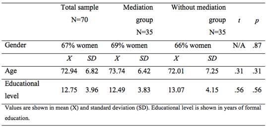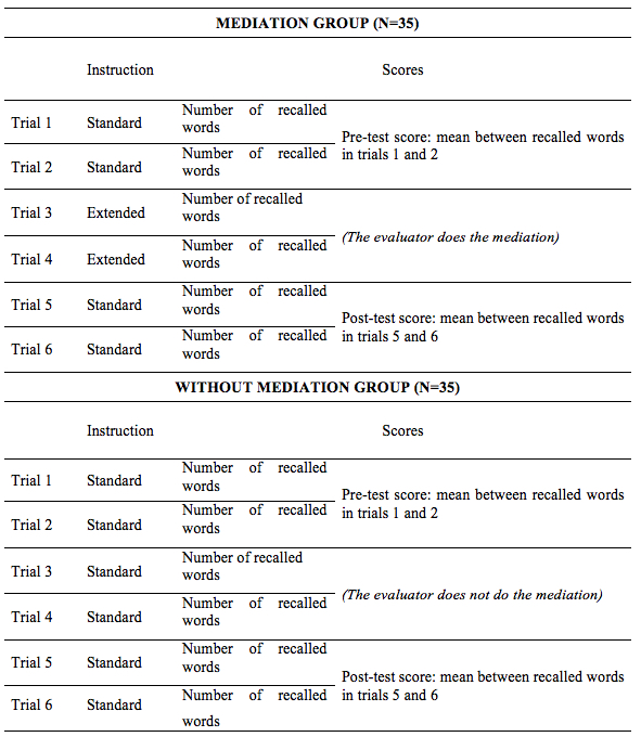 The 70 participants were randomly divided into two groups of 35 subjects each: one group received mediation (MG) in A3 and A4 trial of the AVLT-LP, and the other group didn´t receive mediation or training in those trials (NoMG). The differences in the application procedure of the AVLT-LP according to the groups are described in Table 2. As mentioned above, the standard instructions applied to the NoMG, consisted of the neutral reading of the words in the list and the recording of the words remembered by the subject, i.e. without interventions by the evaluator. On the other hand, the MG received the extended instructions (provided by Calero & Navarro-González, 2006) consisting in reading the words on the list together with an active intervention by the evaluator (mediation), providing, in trials 3 and 4, feedback on their performance and a reinforcement in the reading of the words that the subject has not yet learned, recording the words recalled in each trial.