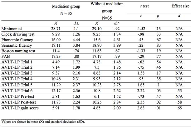 The performance in the neuropsychological tests between both groups was compared (see Table 4). The performance in classical neuropsychological tests, such as the MMSE (p= .13), Clock Drawing Test (p= .33), Phonological Verbal Fluency (p= .67), Semantic Verbal Fluency (p= .83), abbreviated Boston Naming Test (p= .19) and FAB (p= .77), did not present statistically significant differences between the groups. In terms of the AVLT-LP, both groups started remembering a similar number of words (p> .05), but the MG ended up remembering significantly more words than the NoMG in trial 6. The MG recalled more words after the mediation was done in trials 3 and 4, ending with statistically significant differences in trial 6 (t (68)= 2.22; p= .03). A significant effect size of moderate magnitude was observed for the differences between the groups in trial 6 (d= .55). The comparison of the pre-test score (average between trials 1 and 2) resulted in similar scores between the two groups (p= .47), but the post-test score (average between trials 5 and 6) evidenced higher scores in the MG (t (68)= 2.35; p= .02), indicating that those subjects who were exposed to mediation from trial 3 an 4, finished the test with a better performance than those who did not. In this case, a significant effect size of moderate magnitude was also observed for the differences between the groups in the post-test score (d= .58).