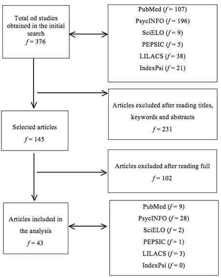 The initial search resulted in a total of 376 publications. After applying the inclusion/exclusion criteria to the titles, keywords and abstracts and later after complete reading of the articles, 43 studies were selected, as shown in Figure 1.