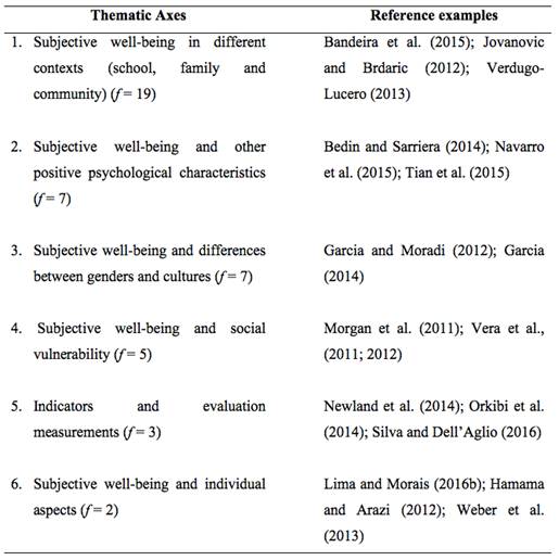 The qualitatively analyzed publications were classified into six thematic axes (see Table 2), in which the main themes and results addressed in the studies were highlighted, contributing to the findings related to the psychological evaluation, to the determinants of SWB, as well as to the relationship of SWB with the other positive psychological characteristics.