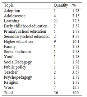 The topic of learning appears the most frequently in table 2 (37.5%), followed by the topic of higher education (16.1%), the work environment (12.7%) and adolescence (7.15%). This range of topics suggests possibilities for diverse and fruitful investigations of the current political, social and educational situation. It is understood that the interest in the topic of learning, in connection with the other topics, can be explained by the fact that the vast majority of graduate students (graduating with master's degrees) are in Pedagogy (teachers, school and education managers) and Psychopedagogy, an area dedicated to the specificities of the learning processes of children, adolescents and adults that seeks to diagnose the causes of learning difficulties.