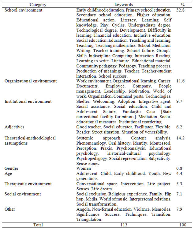 In order to strengthen our analysis of the keywords and facilitate the interpretation of table 4, the keywords were grouped into categories of similar topics. Thus, the following categories were created: school environment (32.8%), organizational environment (11.6%), institutional environment (9.7%), adjectives (6.2%), theoretical and methodological assumptions (2%), gender (0.8%), age (4.4%), therapeutic environment (7.3%), social environment (5.1%) and "other" (due to their specificity), totaling 7.9 %. It is worth mentioning that the most cited keywords were in the school environment category, consistent with the line of research and the Psychology Program in question.