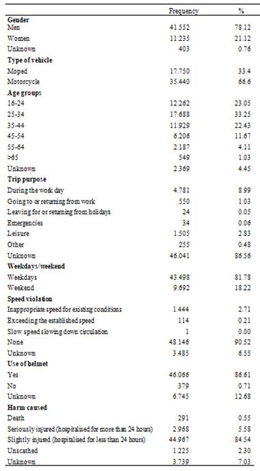 After filtering and selecting the crashes that had taken place in the province of Barcelona, the database included a total of 53.190 motorcycle and moped drivers involved in traffic crashes during the studied period.