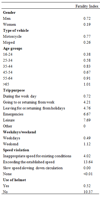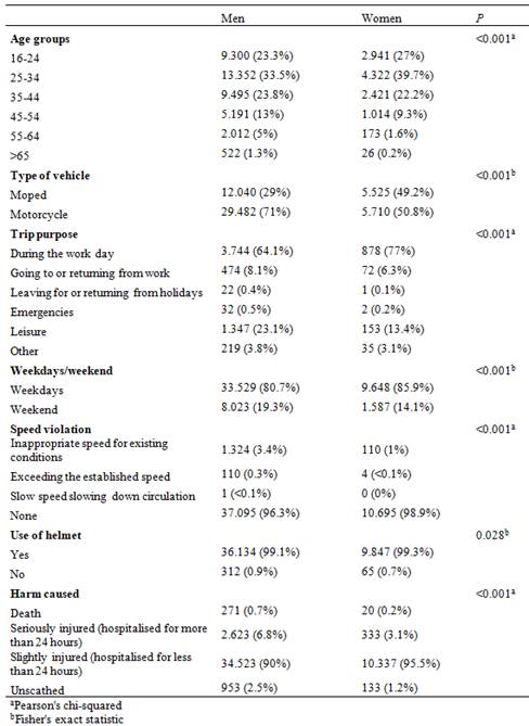 The variables studied were gender, type of vehicle, age, trip purpose, day of the week, speed infractions, helmet use and severity.