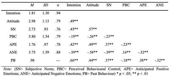 Here, it should be noted that, unlike in studies such as those of Rivis, Sheeran and Armitage (2009), positive anticipated emotions have a stronger relationship with intention than negative ones, possibly owing to immediate reactions to behaviour being more important for the subjects than the future repercussions on academic and work performance.