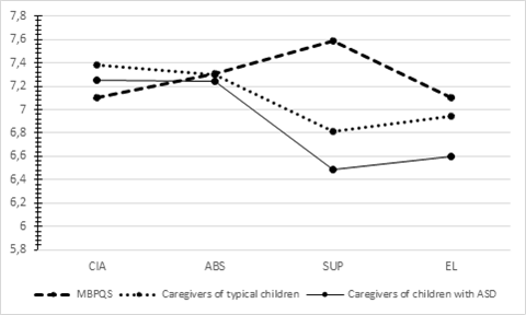 Figure 1 shows an overview of the average scores of the scales for the MBPQS and for the ideally sensitive profiles of caregivers of children with typical development and those with ASD.