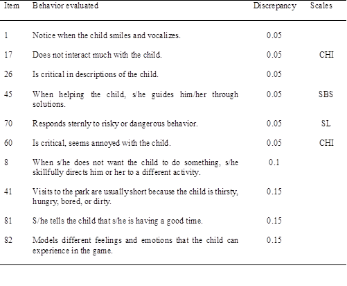 Regarding the behaviors with scores similar to the criterion (Table 3), 12 items were identified with differences between 0 and 0.1 points. Of these 12 items, seven are not part of the sensitivity dimensions, while the remaining five correspond to the CHI, SL, and SBS scales. The CHI scale had the most items with similar scores to the criterion (items 17, 78, and 85). There were no similarities in the SUP scale, which was also found for the development of ideal profiles of caregivers of typical children. This result demonstrates that, in general, in the Ecuadorian context, the supervision and monitoring of children has similar characteristics for both groups of children, regardless of if they are characterized by typical development or ASD. In addition, three items showed similarity with the criterion in the ideal profile of caregivers of typical children; these items are 17 (CHI scale), and 8 and 41, which are not part of the sensitivity dimensions.