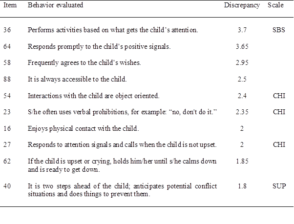 Next, in the profiles constructed by each group, the items were classified by scales, the average scores were calculated, and these were contrasted both between the groups and with the criterion score of each scale, with which the differences and similarities in the sensitivity dimensions were assessed. Finally, an item-level analysis was performed; for this, approximately 10 items were selected from both the profile constructed by the caregiver figures and that by the professionals that showed the least and greatest discrepancy with the MBPQS sensitivity criterion.