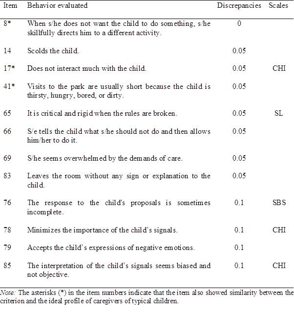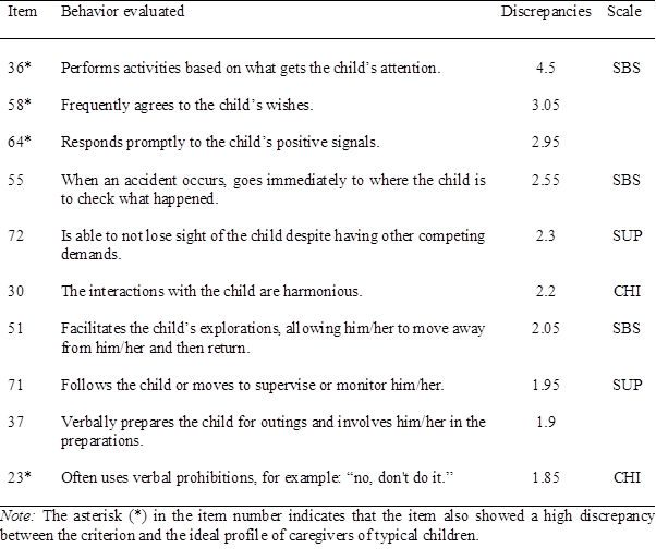 Regarding the largest discrepancies between the ideally sensitive profile of caregivers of children with ASD and the MBPQS normative criterion, 10 items were identified with differences in absolute values between 4.5 and 1.85 points (Table 4). Three of these items are not part of the sensitivity dimensions, while the other seven belong to the SBS, SUP, and CHI scales. No such high discrepancies were found for the SL scale, nor were they found in the ideal profile of caregivers of typical children. This result indicates that in setting limits, participants expect caregiver figures to demonstrate behaviors similar to those of the criterion, regardless of whether or not the child has ASD. Additionally, four of the 10 selected items also presented high discrepancies in the construction of ideal profiles of caregivers of typical children.