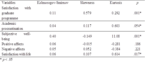 Table 1: Kolmogorov-Smirnov test, skewness, kurtosis and size of the effect of satisfaction with graduate programme, academic procrastination and subjective well-being
