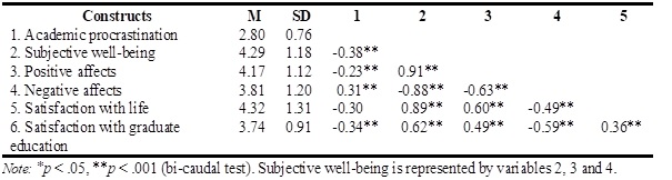 Initially, a Pearsonrcorrelation analysis was carried out to determine the pattern of correlations between academic procrastination, subjective well-being and satisfaction with the graduate programme. The results are shown in Table 2 below.