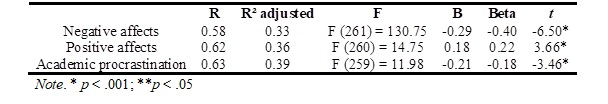 Subsequently, it was decided to test the extent to which satisfaction with the graduate programme is predicted by academic procrastination and subjective well-being (total score and factors). In this direction, a multiple regression analysis was carried out, considering academic procrastination and the factors of subjective well-being (positive and negative affects and satisfaction with life) as predictors of satisfaction with the graduate programme, adopting thestepwiseestimation method, since that method minimizes the multicollinearity effect, objectively selects the variables, enhances the predictive power and is more parsimonious in the selection of the model, adapting the exploratory nature of the study (Hair, et al., 201 5 ). The results are shown in Table 3below.