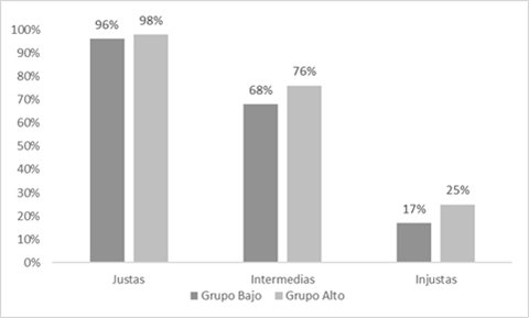 En cuanto a las preferencias sociales, los resultados obtenidos de la comparación de las decisiones en el JU entre el GB y el GA demostraron que no hubo diferencias estadísticamente significativas en la tasa de aceptación. En relación al nivel de justicia de las ofertas, los resultados evidenciaron que los participantes aceptaron más las ofertas justas que las intermedias e injustas, en coincidencia con lo observado por Mola et al. (2018).