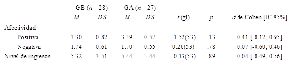Se compararon los niveles de afectividad entre el GB y el GA y, tal como se esperaba, no se observaron diferencias estadísticamente significativas. Adicionalmente, se comparó el nivel de ingresos entre ambos grupos no apreciándose diferencias significativas (Tabla 1). Si bien uno de los tamaños del efecto fue mediano, el intervalo de confianza indica que puede deberse a una fluctuación aleatoria, quizás ligada al tamaño muestral.