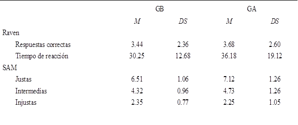 Al considerar el tiempo de reacción que tuvieron los participantes en la prueba de Raven se observó que, si bien los participantes del GB tuvieron un tiempo de reacción menor que los de GA, no se observaron diferencias estadísticamente significativas. En este caso, no se apreciaron efectos significativos de las covariables (Tabla 2).