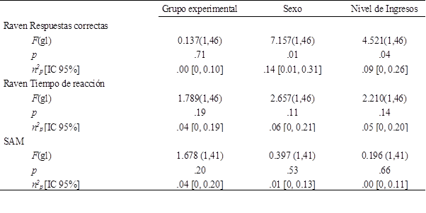 Se examinaron los supuestos de normalidad y homogeneidad de varianzas para las variables dependientes, cumpliéndose los mismos de manera aceptable. Los resultados indicaron diferencias estadísticamente significativas en el desempeño en el vector de medias que comprendían las variables dependientes de la prueba de Raven según el sexo (Lambda de Willks = .680; F (2.45) = 3.652, p = .034, η 2 p = .140). En tanto que no hubo diferencias significativas teniendo en cuenta la condición experimental (Lambda de Willks = .962; F (2.45) = .897, p = .415, η 2 p = .038) ni el nivel de ingresos (Lambda de Willks = .903; F (2.45) = 2.420, p = .100, η 2 p = .097).