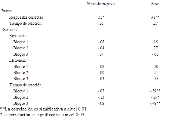 Tabla 4: Matriz de correlaciones de Pearson y Spearman de las variables desempeño en Raven y Diamond, nivel de ingresos y sexo