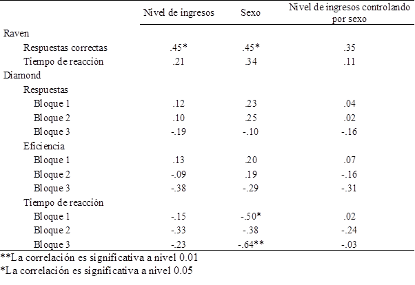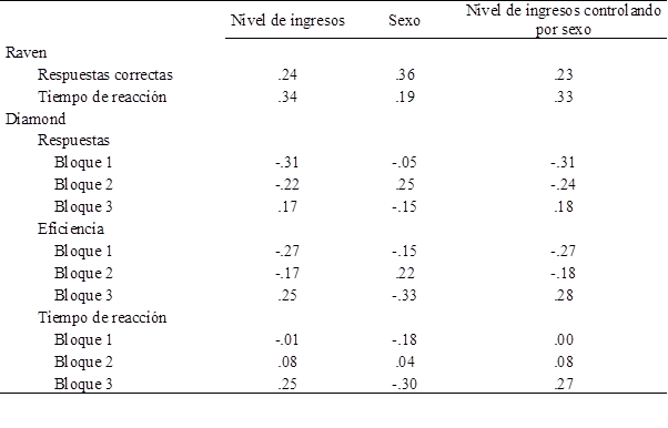 Al reiterar los análisis para cada grupo se implementaron análisis paramétricos para poder apreciar las correlaciones parciales de manera sencilla. Se encontró que en el GB el nivel de ingresos y el sexo no se relacionaron con el desempeño en Diamond. Al controlar por sexo, la relación entre el nivel de ingresos y el desempeño en Diamond tampoco fue significativa (Tabla 5). En tanto que en el GA el nivel de ingresos no se relacionó con el desempeño en Diamond, en cambio sí se relacionó el sexo con el desempeño en los bloques 1 y 3 (Tabla 6).