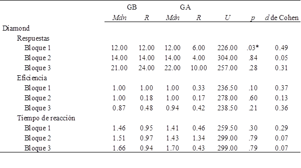 Los análisis de normalidad y homocedasticidad no se cumplieron con lo cual se optó por conducir análisis no paramétricos. Los resultados indicaron una diferencia estadísticamente significativa entre los grupos experimentales en el bloque 1. Los participantes del GA contestaron un número mayor de respuestas ante estímulos congruentes que los participantes del GB. Ninguna otra comparación resultó significativa. En cuanto al nivel de eficiencia de las respuestas y el tiempo de reacción en cada bloque, la comparación entre el GB y el GA no arrojó diferencias estadísticamente significativas (Tabla 7).