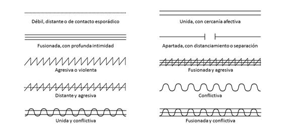 Cuando las pautas vinculares resulten demasiado complejas, se recomienda representarlas en un genograma a parte (McGoldrick & Gerson, 1985). Así, siguiendo con el caso antes planteado, ejemplificamos la representación de los tipos de relación en la Figura 12.