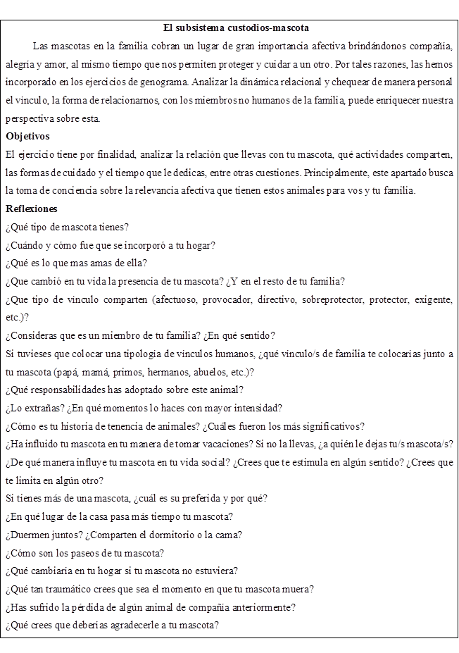 Siguiendo la misma línea de este taller, nos proponemos anexar una serie de ejercicios para que los participantes puedan incorporar el trabajo acerca del subsistema conformado por el animal de compañía y sus custodios dentro del sistema familiar. (Cuadro)