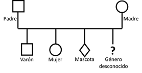 Los animales de compañía también fueron contemplados por las herramientas informáticas que permiten la confección de genogramas o representaciones de árboles genealógicos (ver Metcalf, 2011). La forma gráfica que se le ha dado a las mascotas corresponde al diamante o rombo, y su ubicación en la estructura sería similar a la de los hijos. Si bien este símbolo había sido propuesto para personas de género no especificado (e.g., Bennett et al., 1995; Bennett, French, Resta, & Doyle, 2008), es frecuente que estas personas se representen con un signo de pregunta cerrado (ver Figura 2).