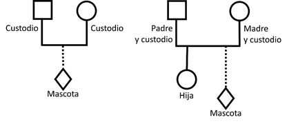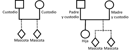 Figura 6: Representación gráfica de la mascota ligada a una pareja de custodios. En el primer caso, el animal está ligado a una pareja sin hijos, y en el segundo, a una pareja con una hija.