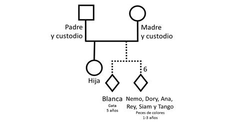 Figura 8: Representación gráfica de una estructura familiar conformada por una pareja con una hija, una gata y seis peces de colores.
