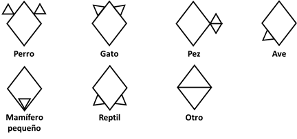Cuando en el genograma familiar debamos consignar más de tres especies diferentes de animales de compañía, o bien, cuando el control zoonótico sea un elemento central de la evaluación (e.g., evaluaciones de salubridad) proponemos la incorporación de variaciones en el símbolo para cada especie. Dadas las frecuencias de tenencia en cultura occidental, y las agrupaciones realizadas frecuentemente de acuerdo con el tipo de interacción (e.g., FEDIAF, 2017; Global GfK Survey, 2016), la clasificación que realizaremos será: gatos, perros, aves, peces, mamíferos pequeños (e.g., conejos, roedores, hurones), reptiles (e.g., tortugas, serpientes, iguanas) y otros (ver Figura 9).