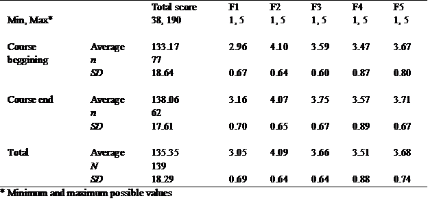 Data is described across comparative cathegories. In cathegory time expent on course, IHS-Del-Prette total score average was 133.17 (SD=18.64) for participants in the beginning of the course and 138.06 (SD=17.61) for those in the end. But total and isolated factors do not differ between initial and final course scores. Rho of Spearman test show correlation between time expent on course and F3 (conversation and social resourcefulness) (p=.05; rho=.16).
