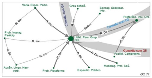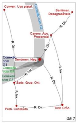 There are five main groups (G1 - G5), which integrate a network composed of only one component, so that all variables are somehow interconnected, that is, there are no disconnected subgroups. Among the groups, G1 (Figure 1) has the largest number of variables involved (16), however it has the lowest density (0.075), while G5 (Figure 5) has the least variables (7) and the highest density (0.190). The density of a graph, varying between 0 and 1, is related to the number of connections, so that denser networks contain more connections between the vertices (Hanneman & Riddle, 2005). This factor has an implication in the integrated functioning of the network, so that the expansion or increase in certain areas tends to reach the others. Thus, despite being a network of only one component, groups with a higher density, such as the G5, have a greater interchange regarding the relationships among variables.